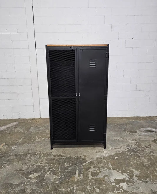 Armoire vintage en acier noir avec porte vitrée et porte style casier dans le bas