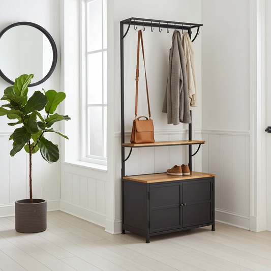 Meubles d'entrée avec banc et rangement, porte-manteau de 32 po, en bois de manguier et acier, meuble avec étagère de rangement et 8 crochets