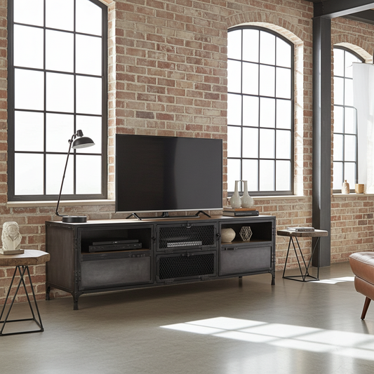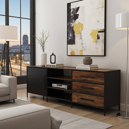 Meuble tv industriel bois Recyclé et acier avec 4 tiroirs