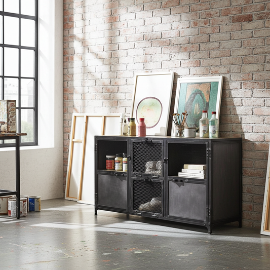 Buffet Ibiza en bois de manguier et acier brut portes vitrées