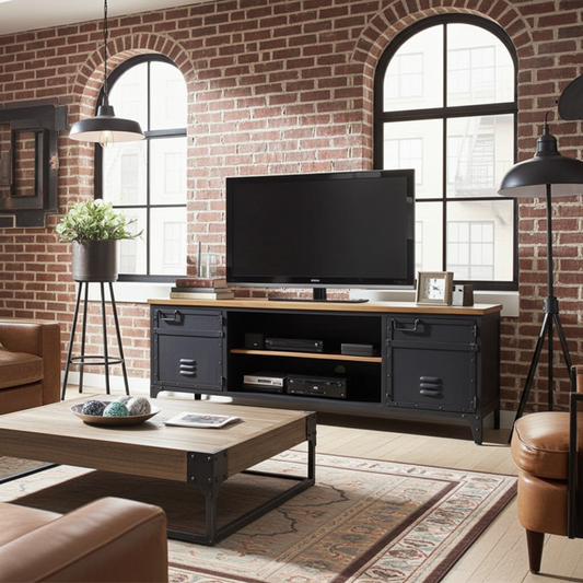 Meuble télé industriel en acier noir style casier dessus en bois de manguier