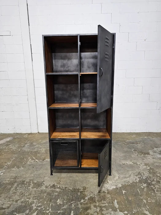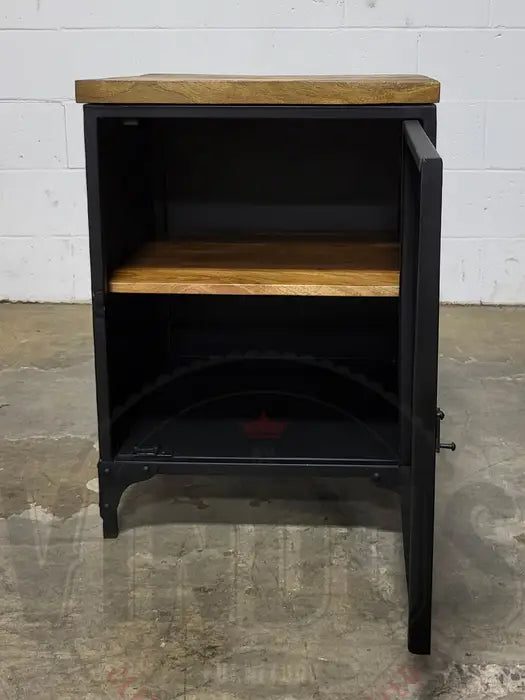 Container-style cabinet made of mango wood with glass door and 2 drawers