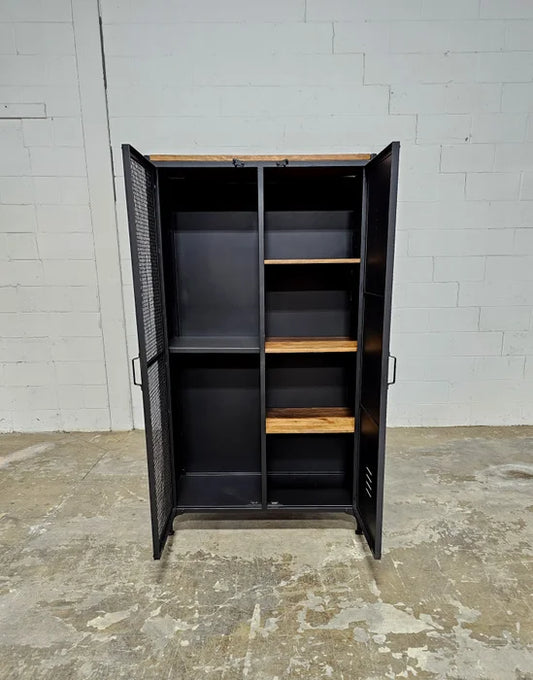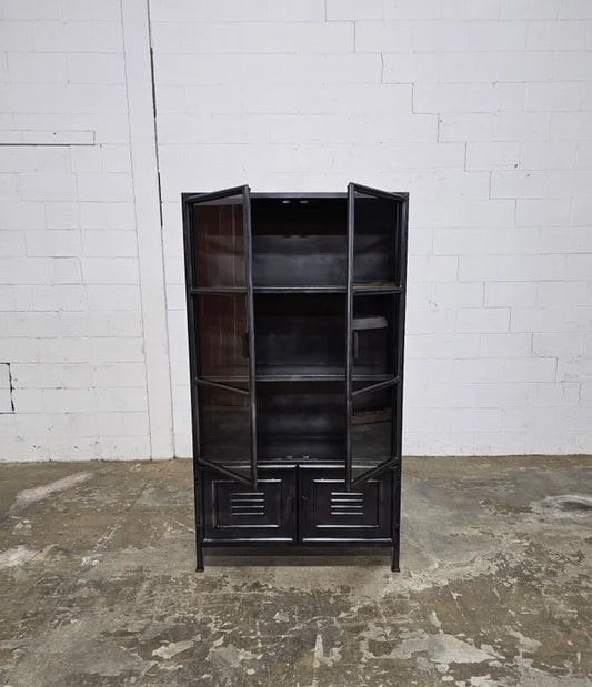 Vintage black steel cabinet with glass door and locker style door at the bottom