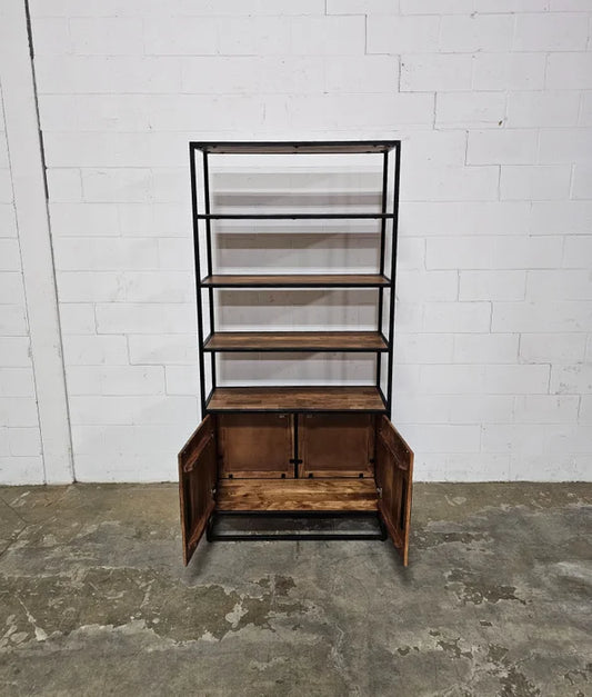 Acacia wood shelf with 2 doors on a black steel structure