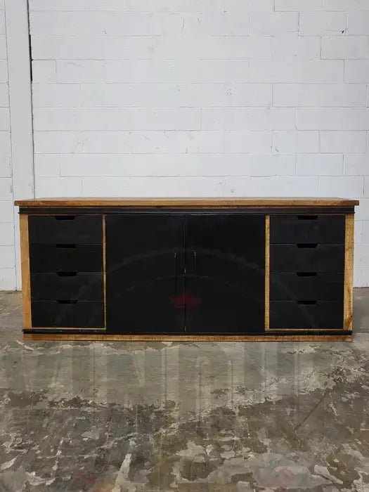 Mango wood sideboard with double sliding steel doors and black drawers