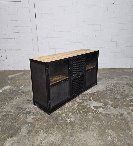 Industrial TV cabinet in antique wood and steel with 2 locker-style doors