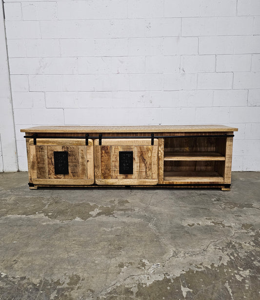 Farmhouse TV cabinet in raw mango wood with sliding doors