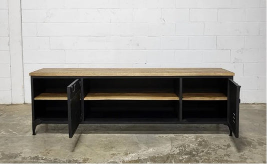 Industrial TV cabinet in black steel with locker style and mango wood top