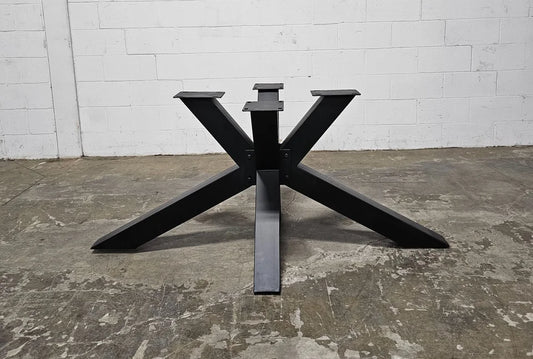 Spider dining table with matte black legs and brown acacia wood top