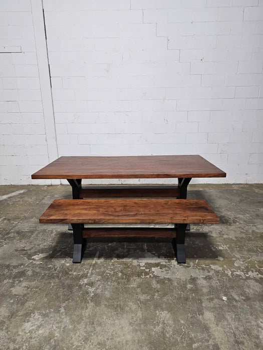 Matte black X-leg dining table with brown acacia top and 1 matte black X-leg bench in brown acacia wood