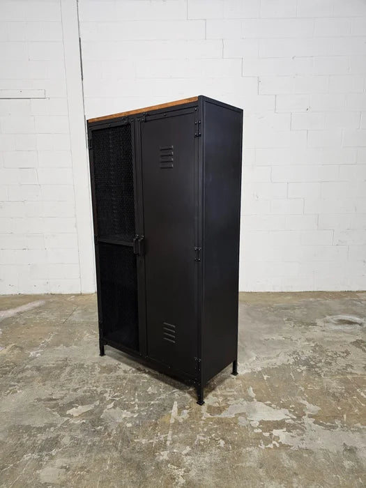 Industrial locker style cabinet with mesh door and 4 shelves inside