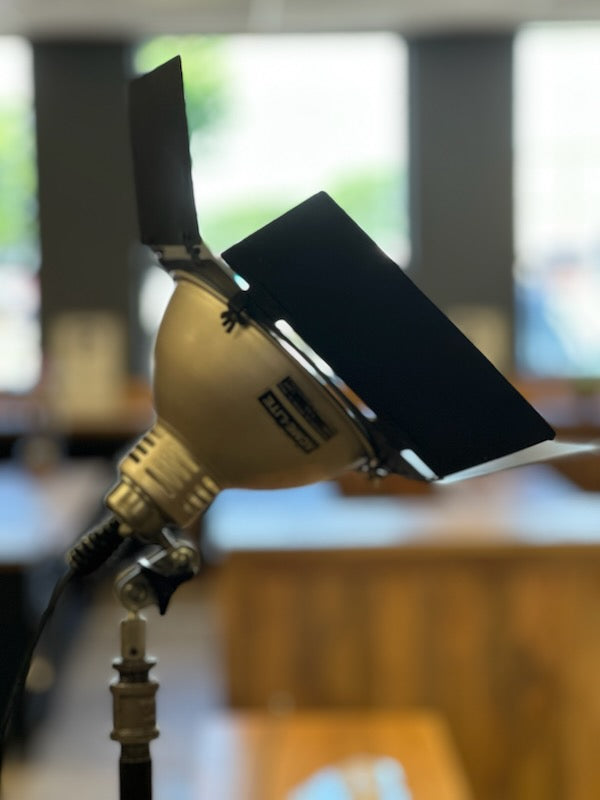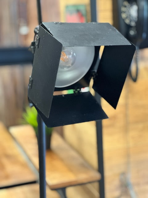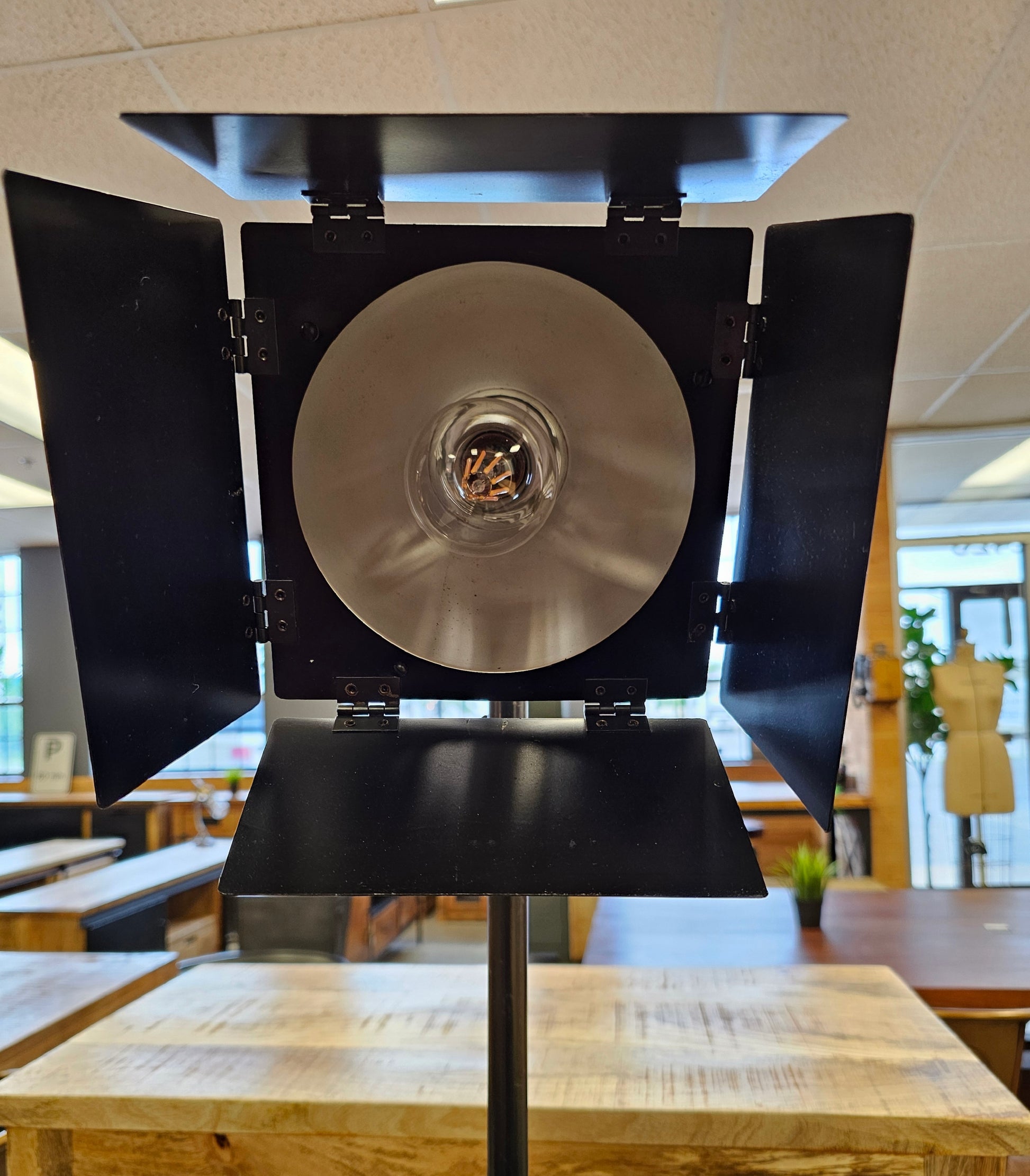 This lamp, handmade by a local artist, is mounted on an antique wrought iron mannequin stand. The spotlight features four adjustable brackets.