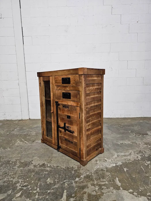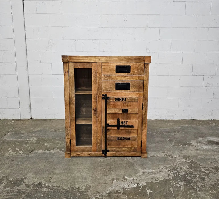 Container style cabinet in mango wood with glass door and 2 drawers