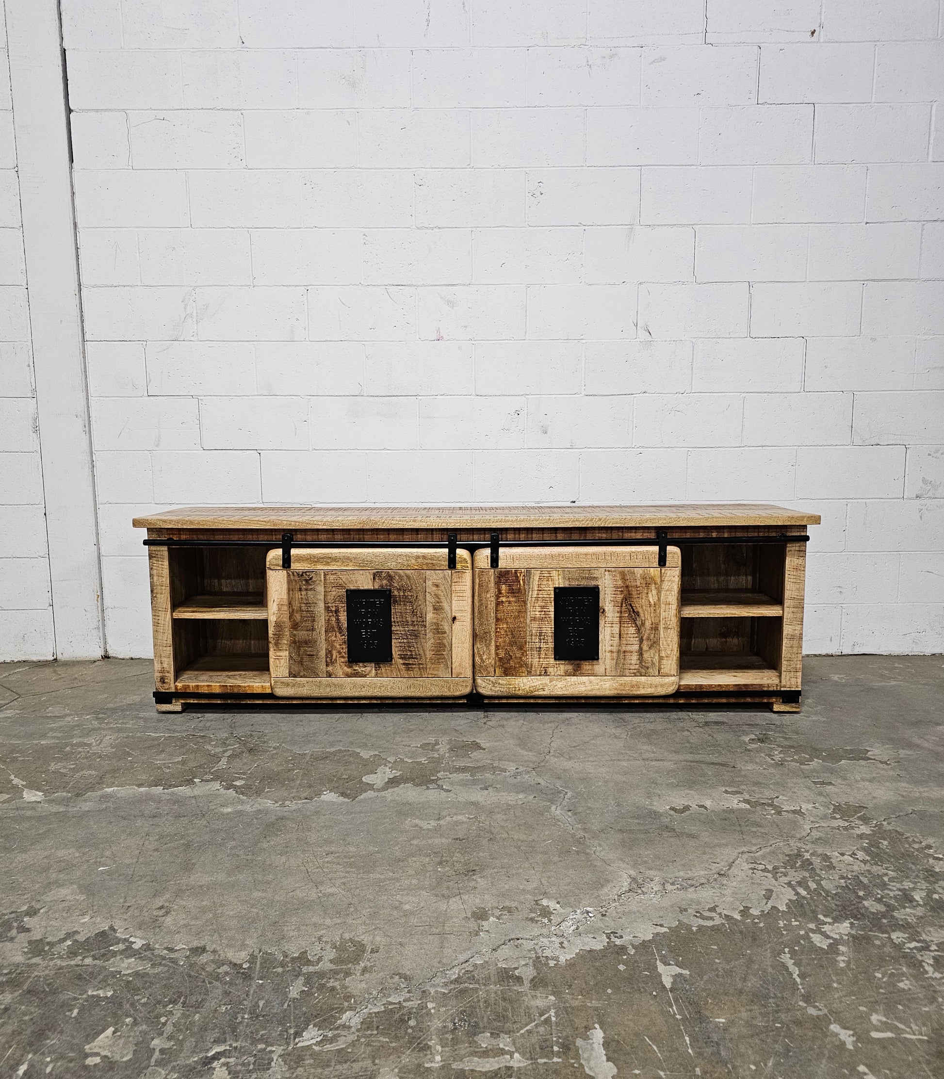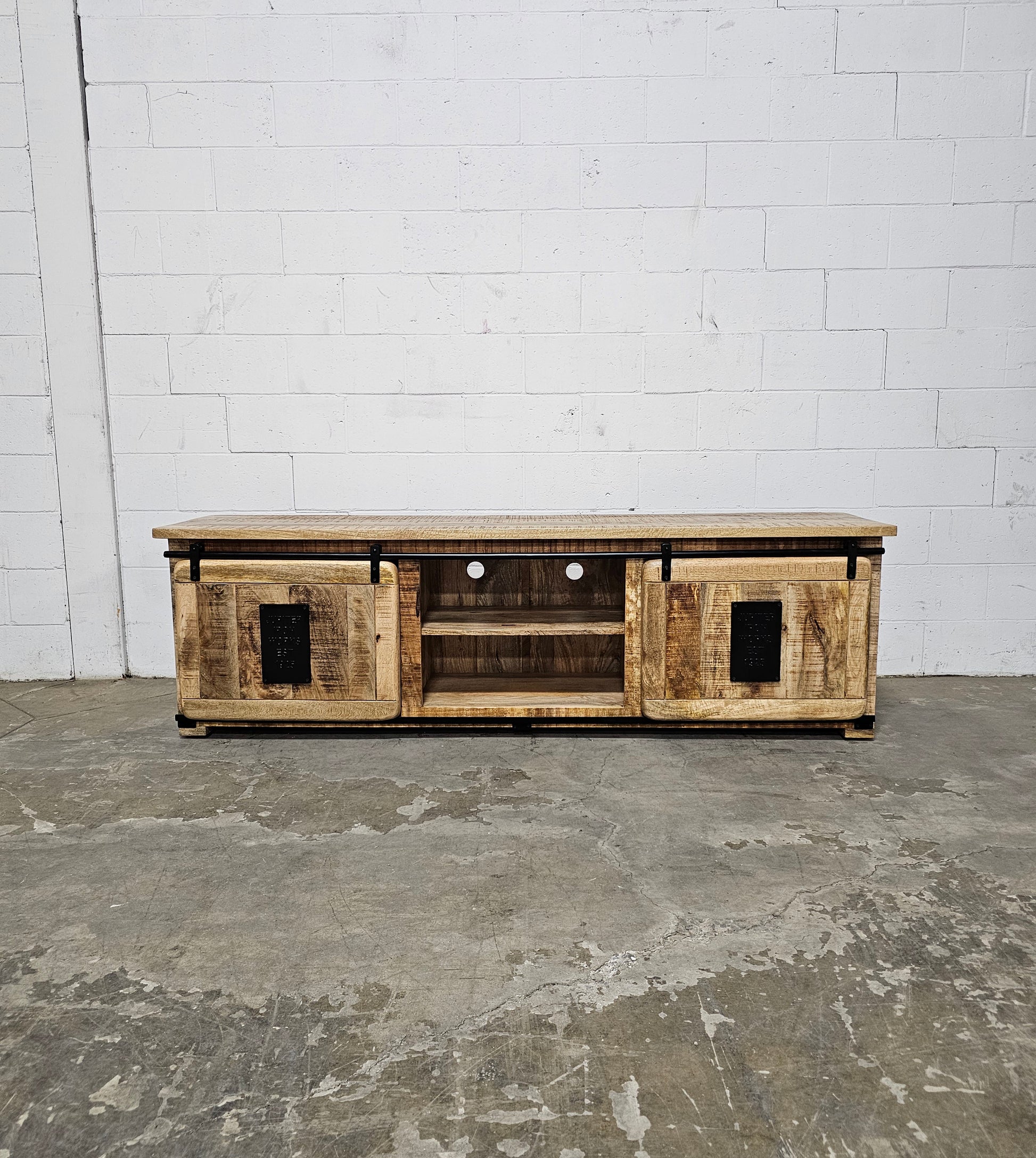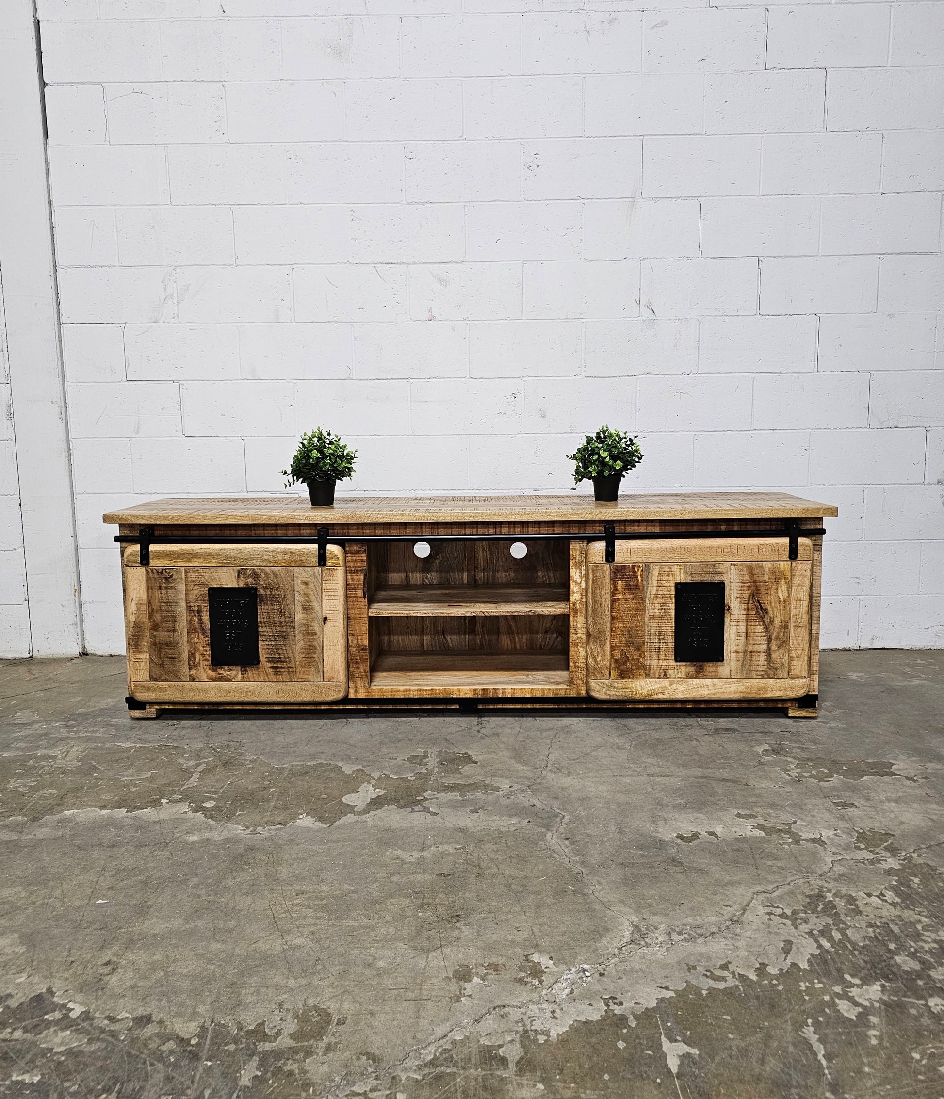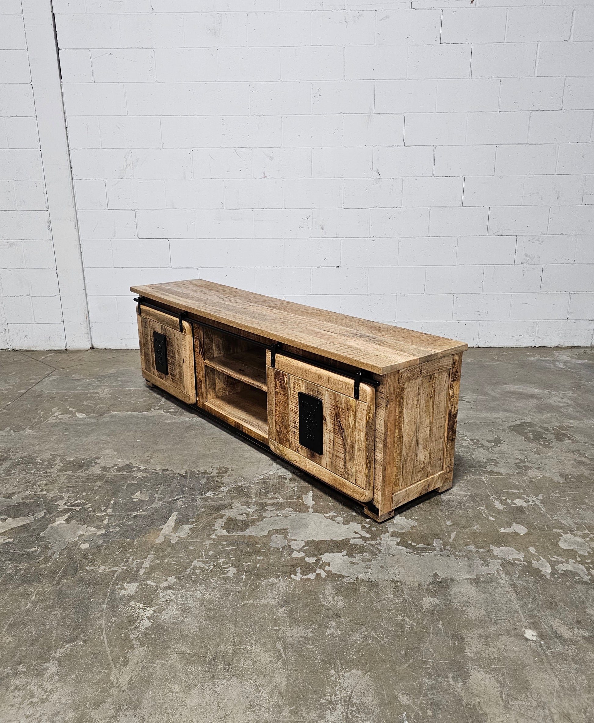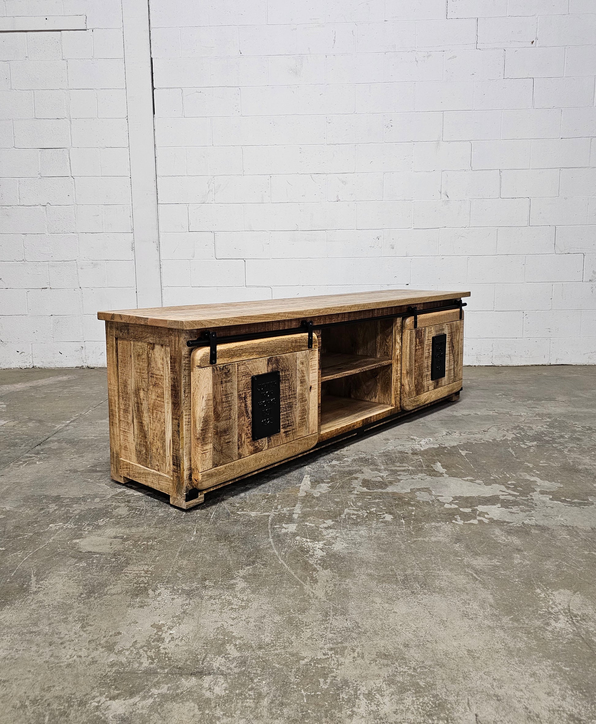 Farmhouse TV cabinet in raw mango wood with sliding doors