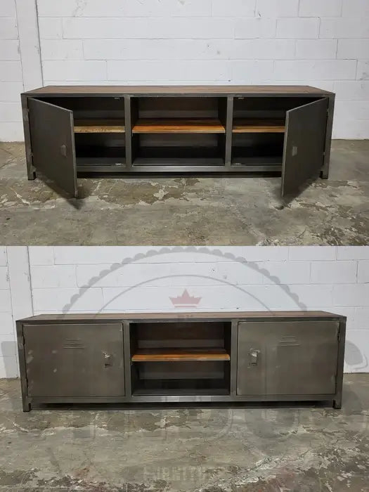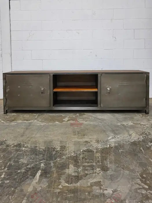 Industrial TV cabinet in antique wood and steel with 2 locker-style doors