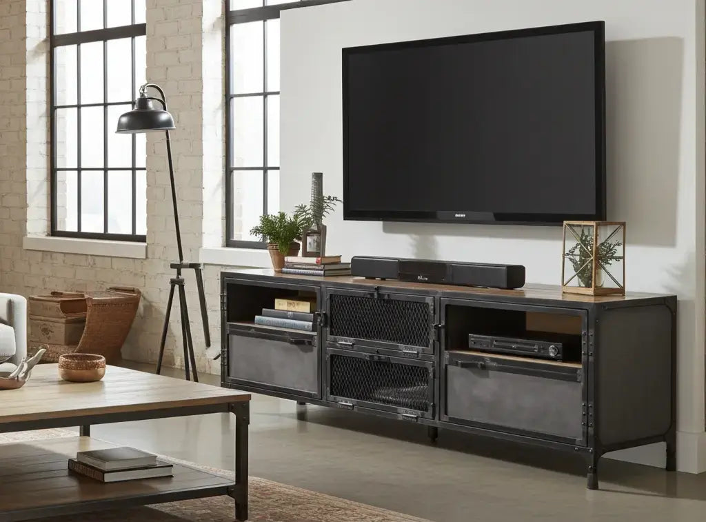 Industrial TV cabinet made of recycled wood and steel with 4 drawers