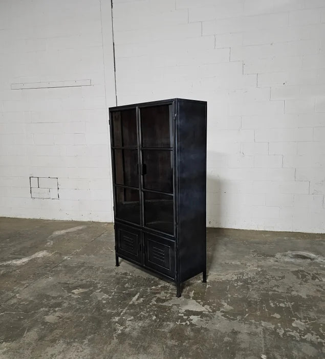 Armoire vintage en acier noir avec porte vitrée et porte style casier dans le bas.