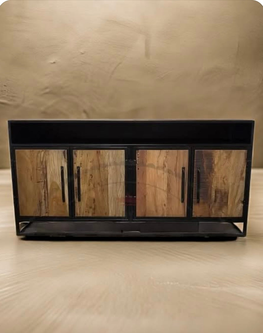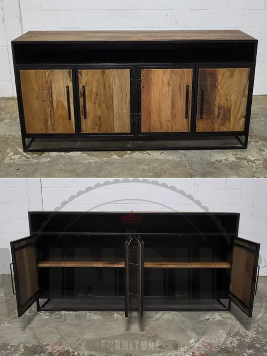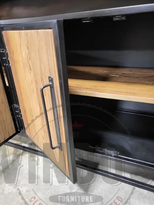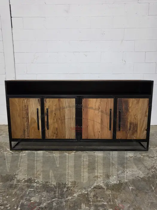 Buffet en métal et bois recyclé sur structure d'acier noir avec tablette en bois à l'intérieur de chaque porte.