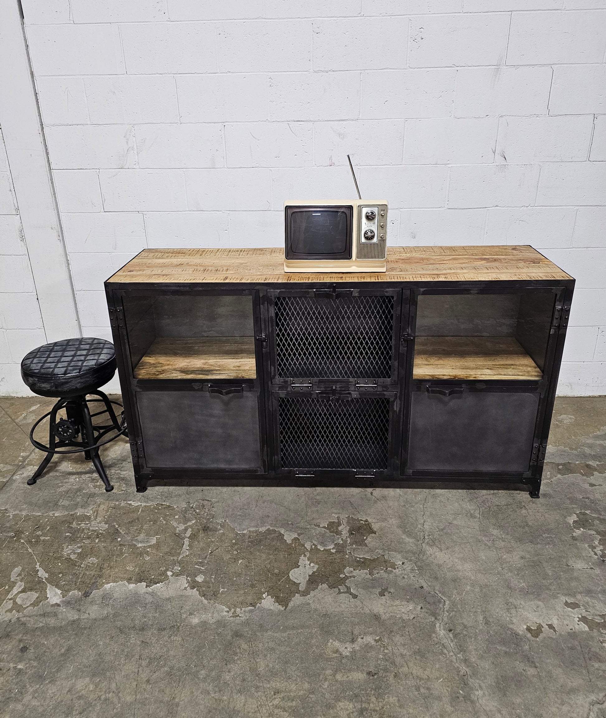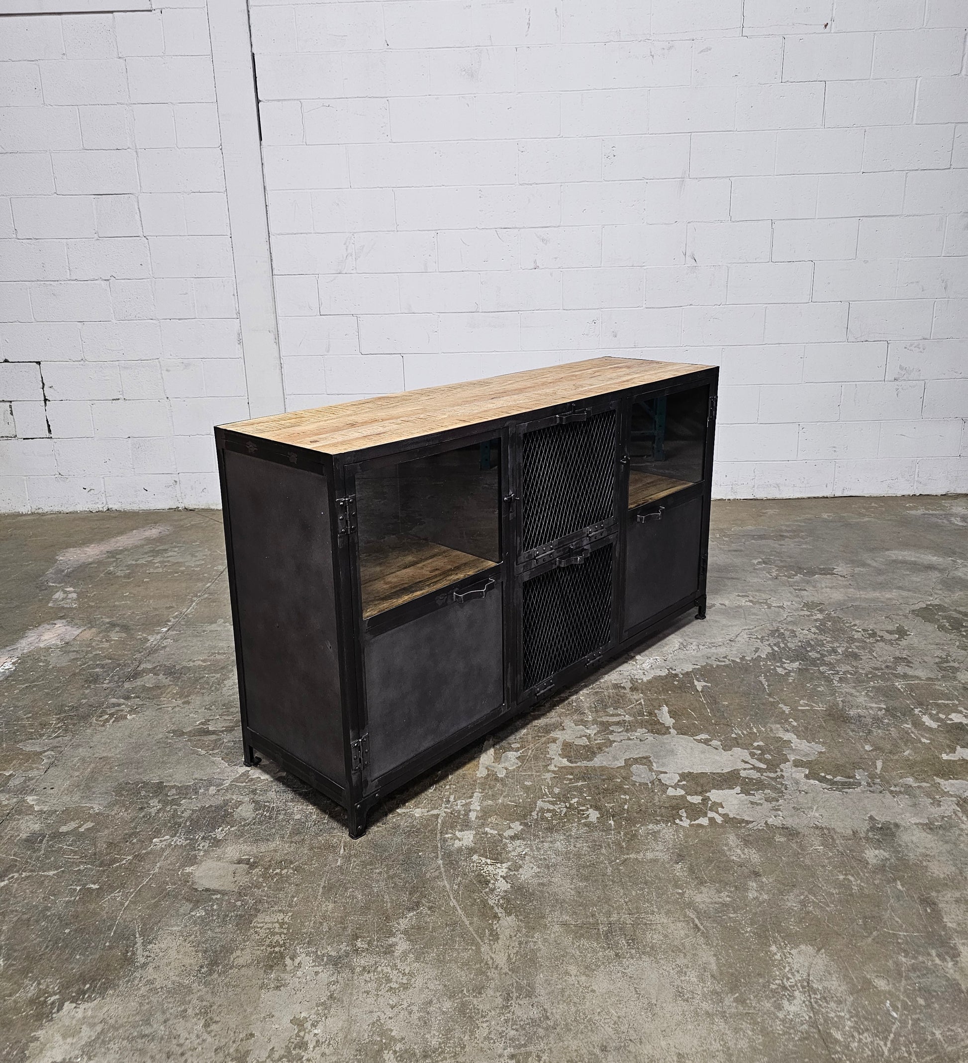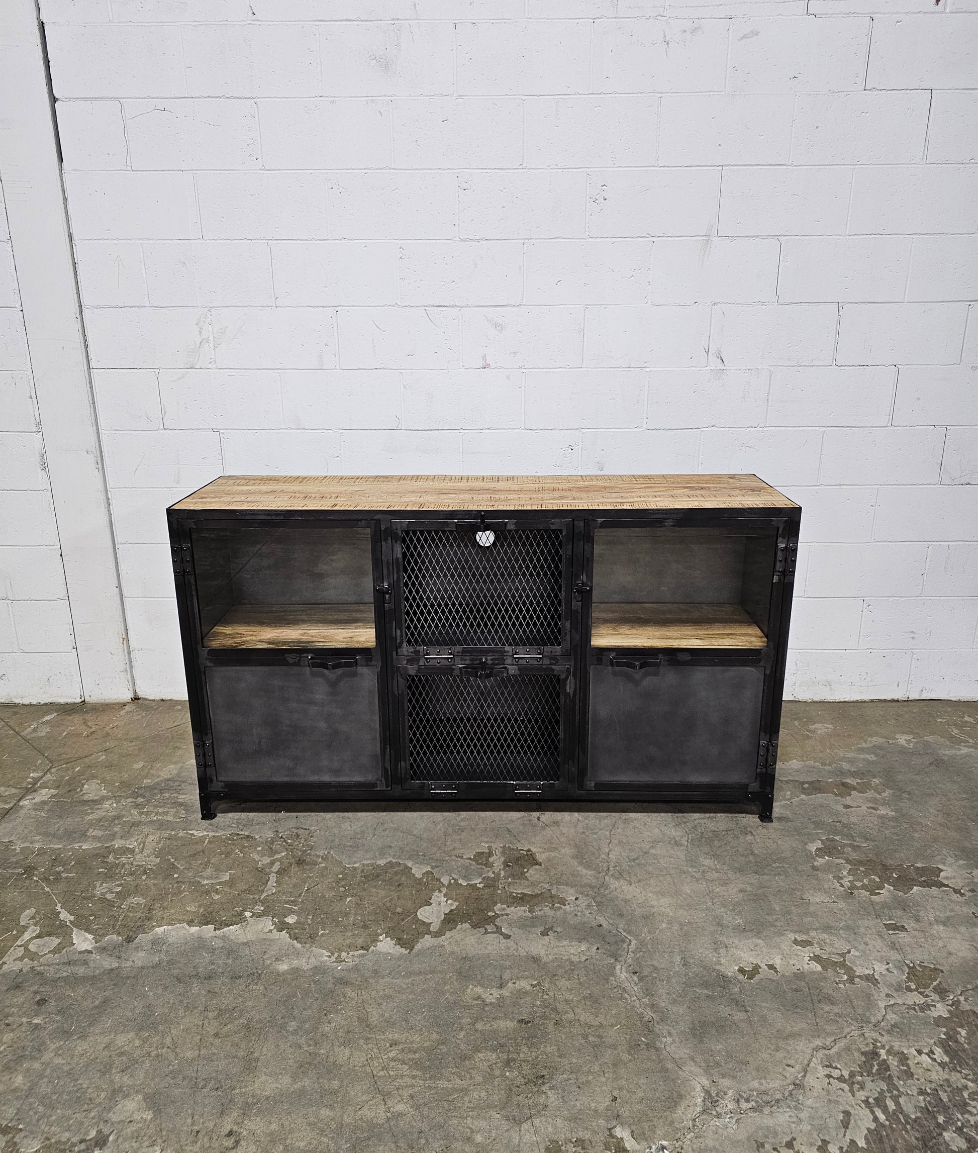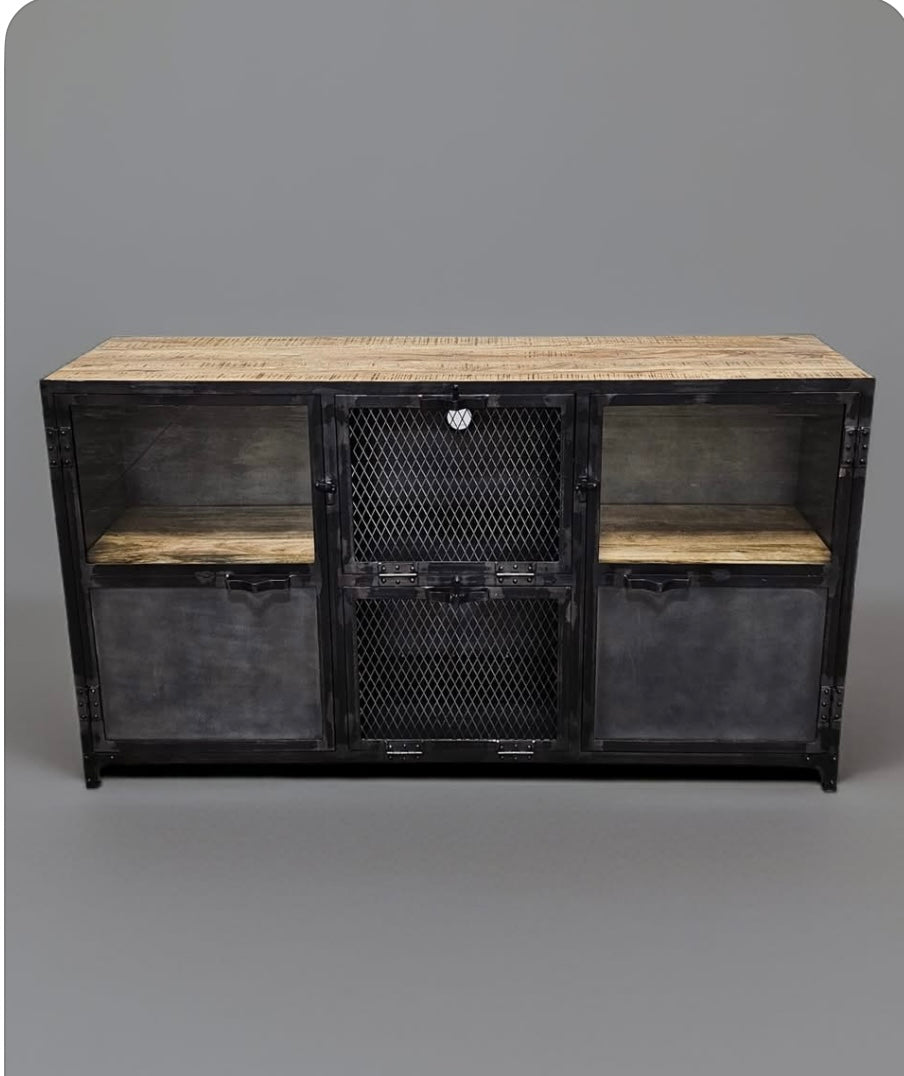 Buffet Ibiza en bois de manguier et acier brut portes vitrées et portes centrales grillagées