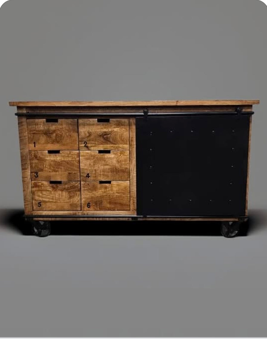 Buffet industriel en bois de manguier et acier noir sur roue avec 6 tiroirs numérotés porte en acier coulissante et une tablette à l'intérieur