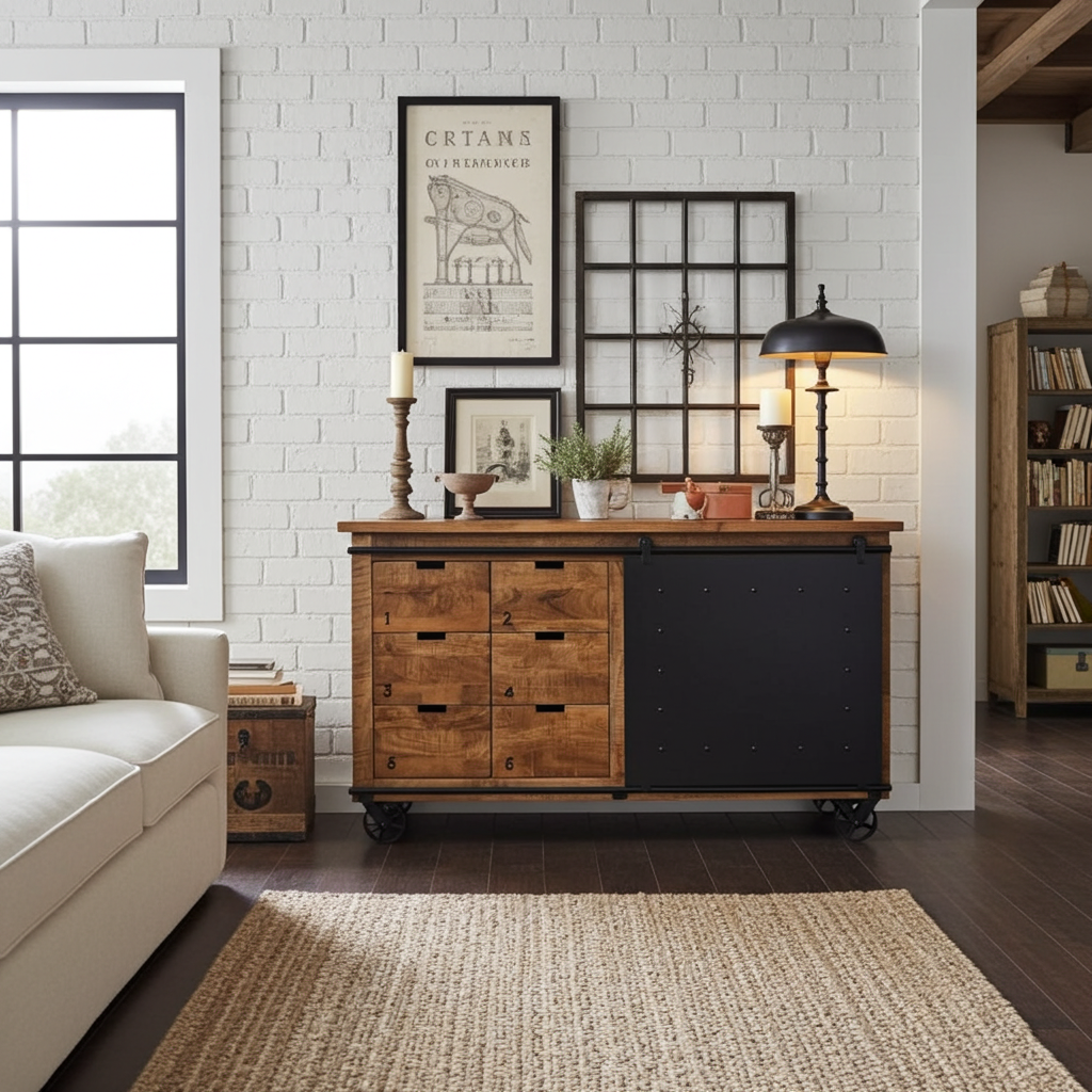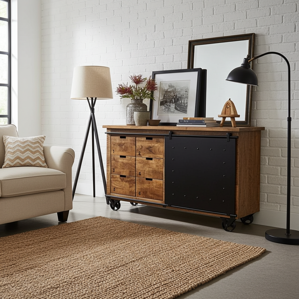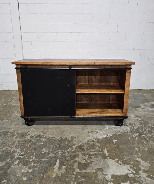 Buffet industriel en bois de manguier et acier noir sur roue avec 6 tiroirs et porte en acier coulissante