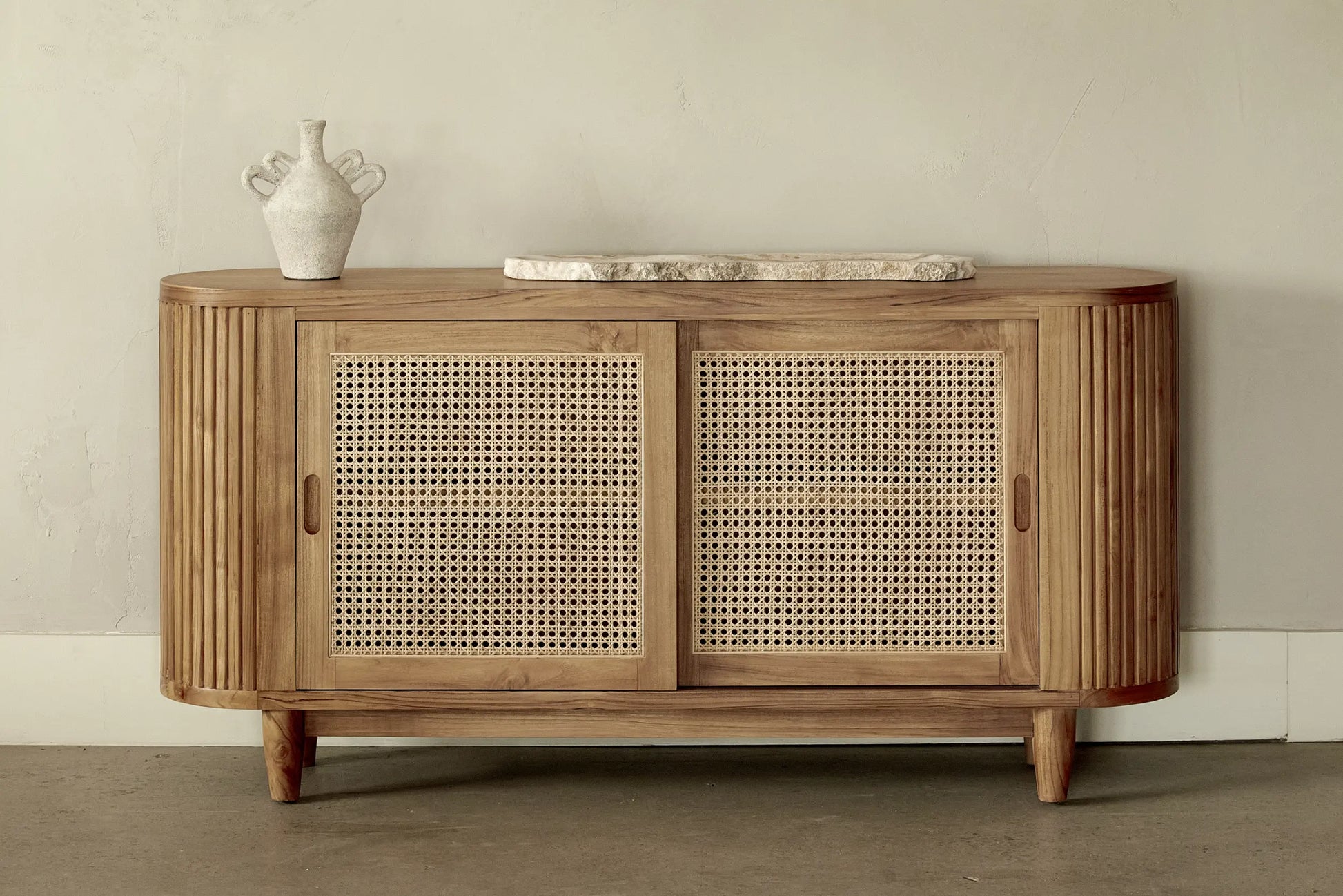 | Version avec lattes de teak au extrémité du modèle Alex, avec ses 2 portes coulissantes, est l'incarnation parfaite de l'élégance et de la fonctionnalité. Fabriqué à partir de matériaux de haute qualité, tels que le bois de teck et le rotin, il promet non seulement durabilité et robustesse, mais aussi une esthétique naturelle et raffinée. Ses formes arrondies lui confèrent une allure douce et accueillante, permettant à ce meuble de s'intégrer harmonieusement dans divers espaces de votre domicile, qu'il s'agisse de votre salle à manger ou de votre chambre à coucher. Opter pour le buffet Alex, c'est choisir un meuble qui allie beauté naturelle et praticité, tout en créant une ambiance chaleureuse et pleine de charme dans votre intérieur. |