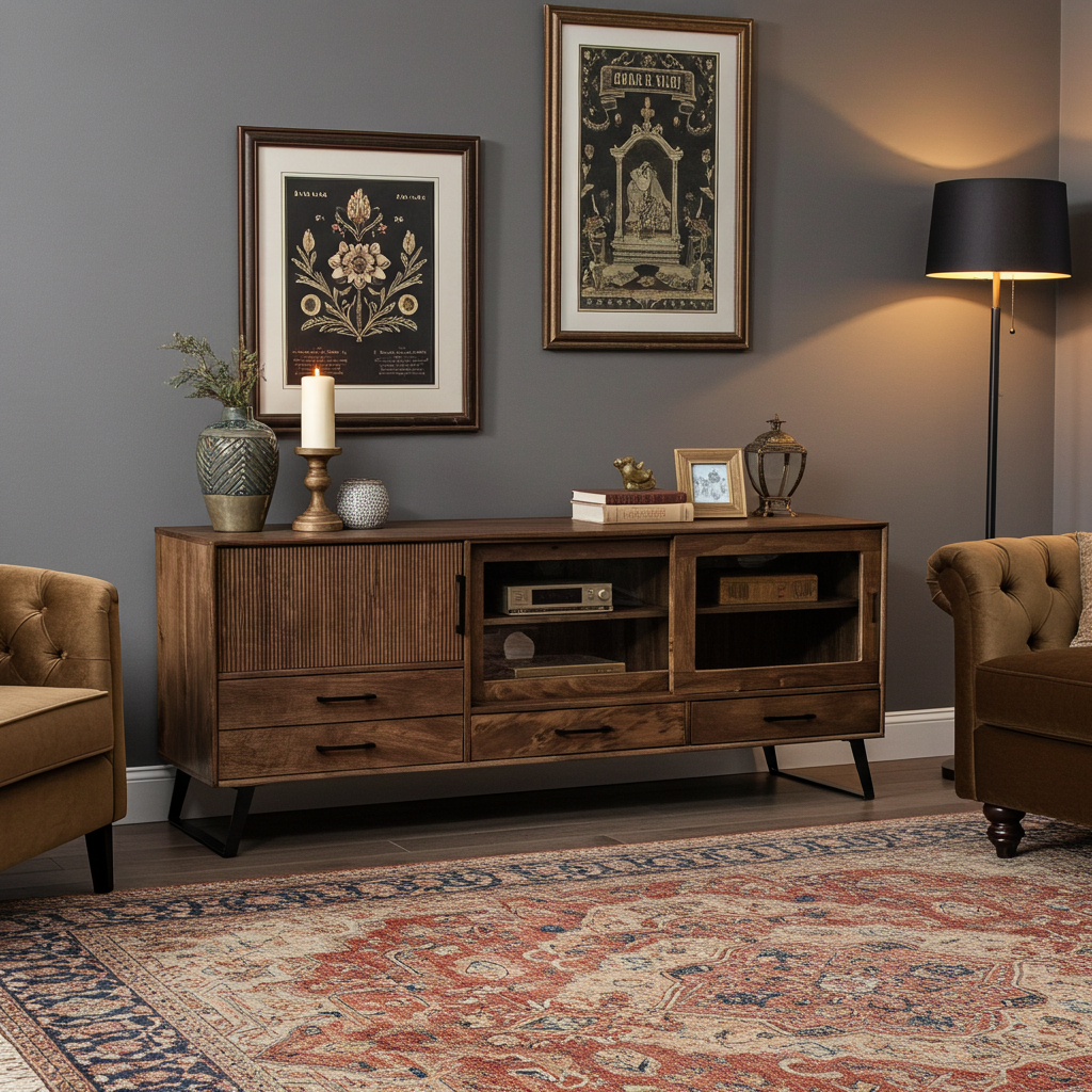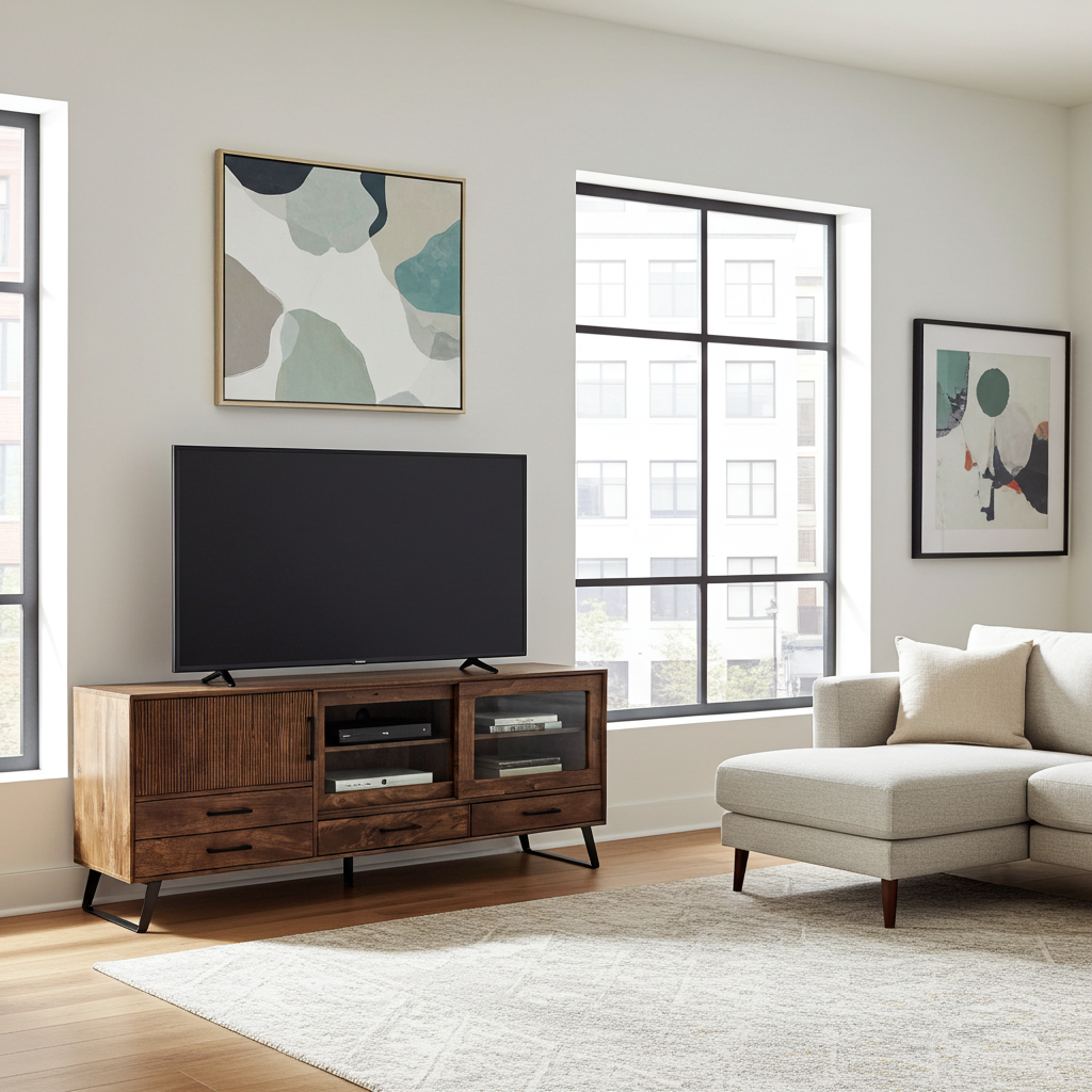 Meuble Télé Arezzo en bois de manguier portes coulissantes vitrées