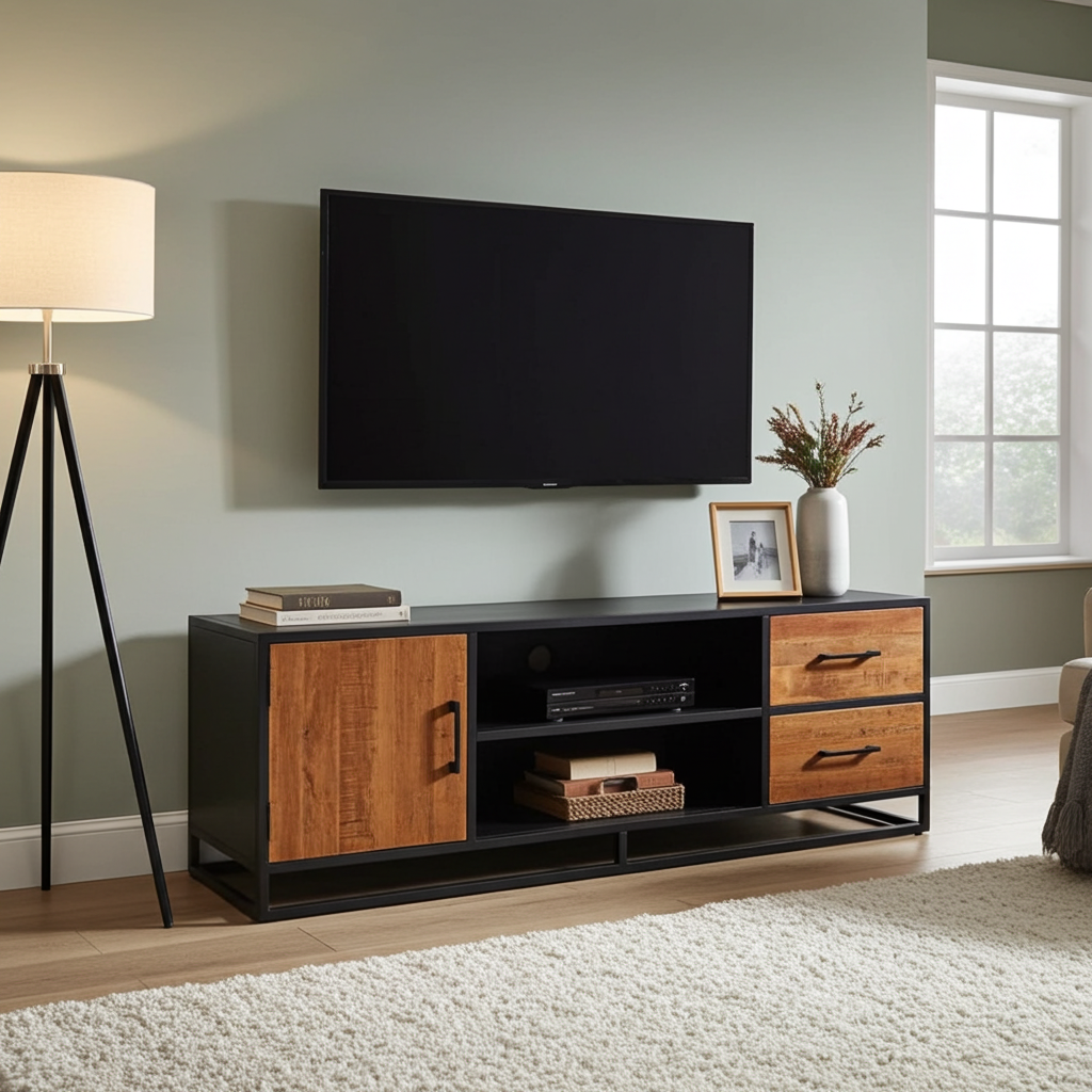 Meuble télé en bois de manguier et structure d'acier noir