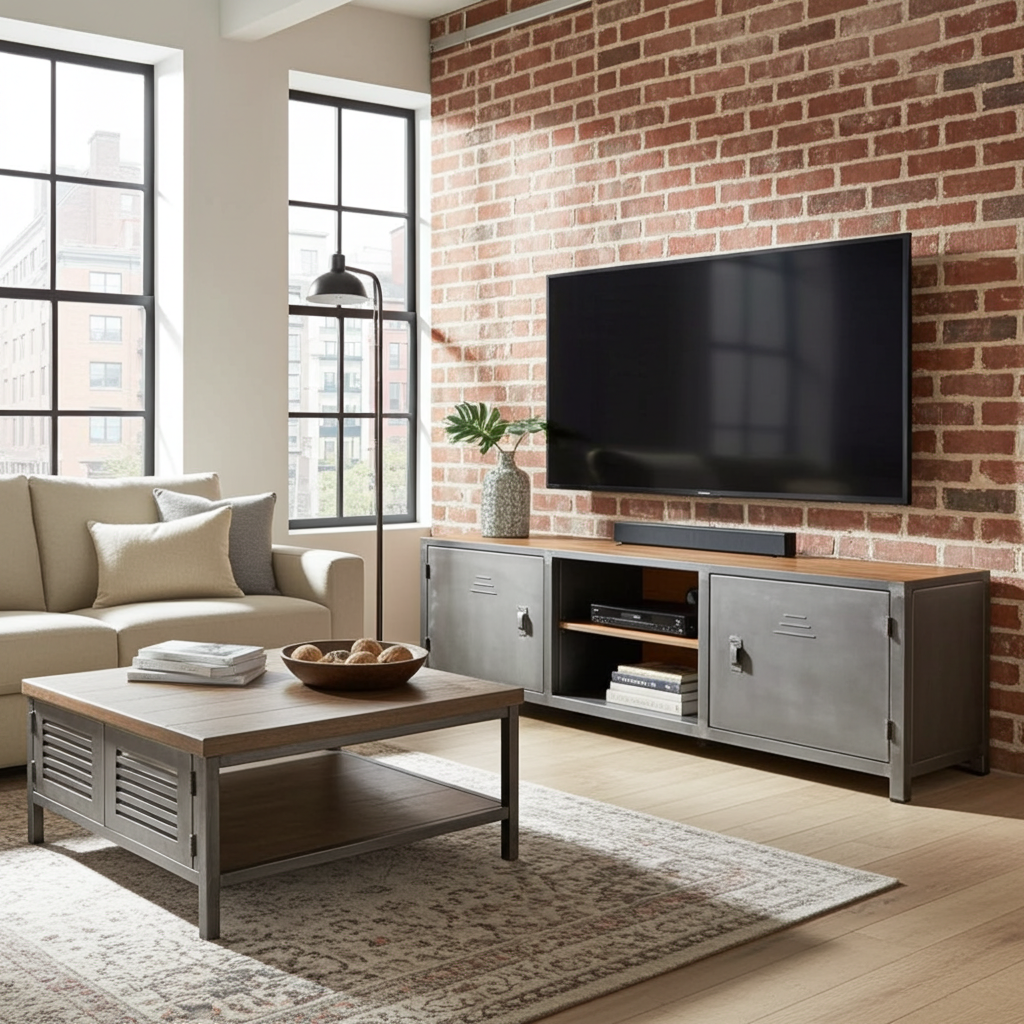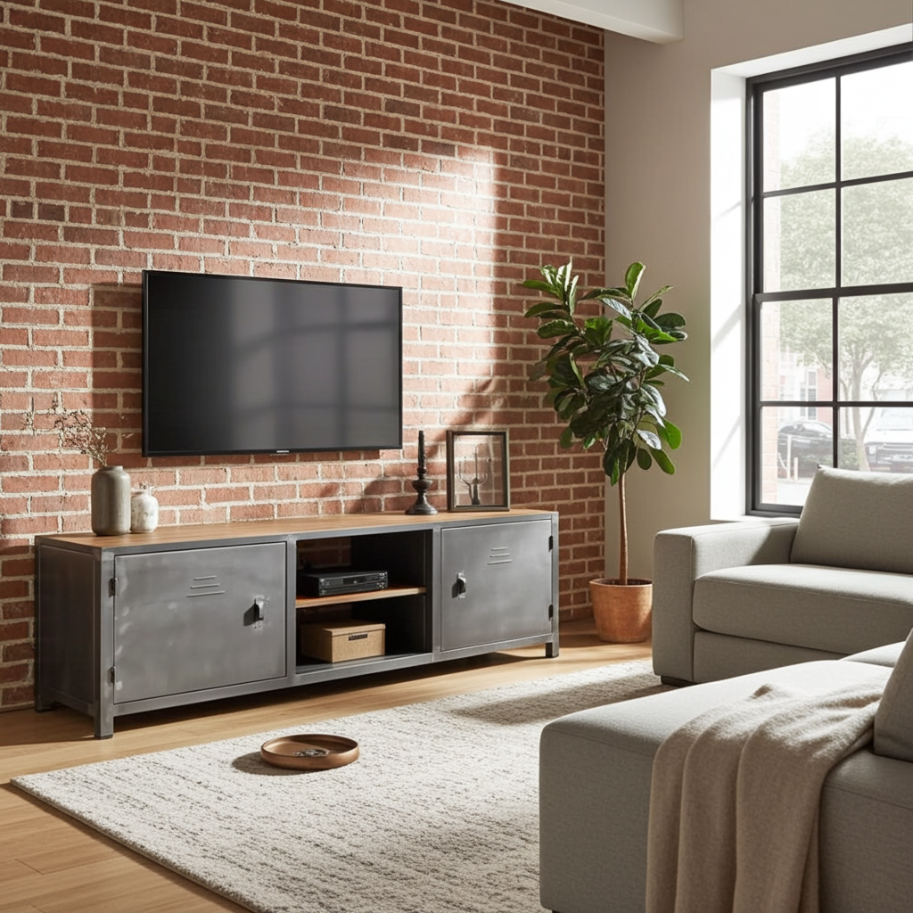 Meuble télé industriel bois antique et acier avec 2 portes style casier