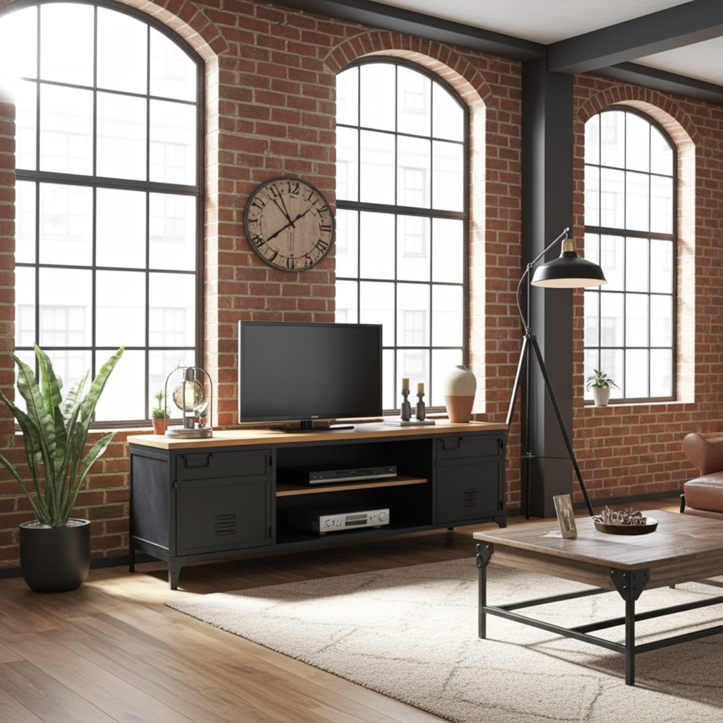 Meuble télé industriel en acier noir style casier dessus en bois de manguier
