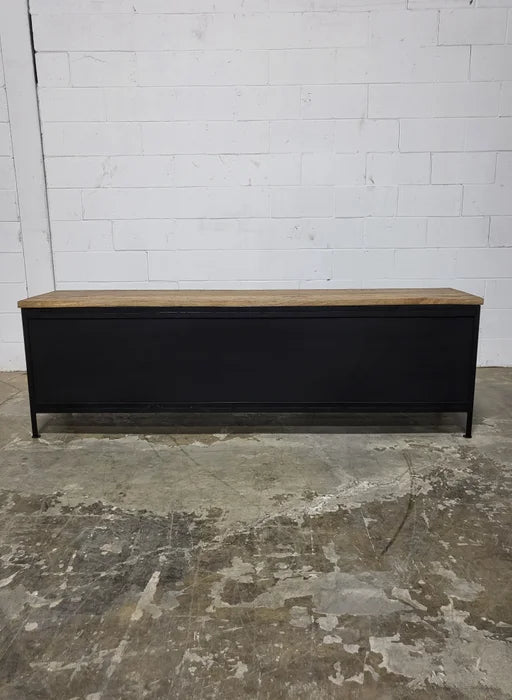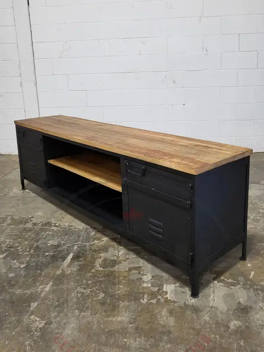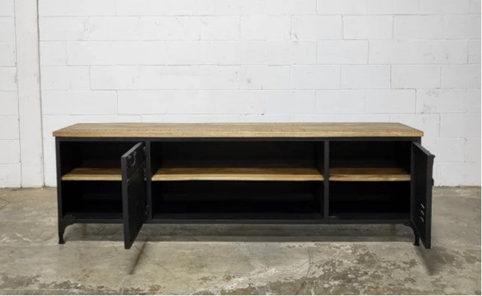 Meuble télé industriel en acier noir style casier dessus en bois de manguier
