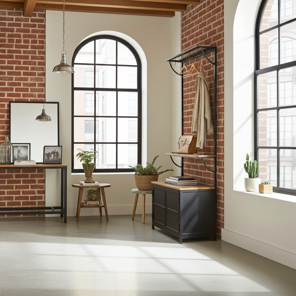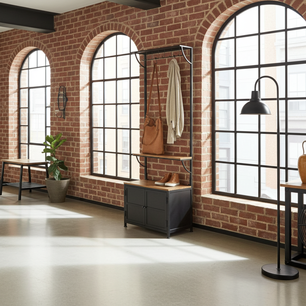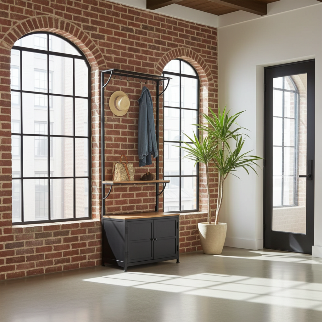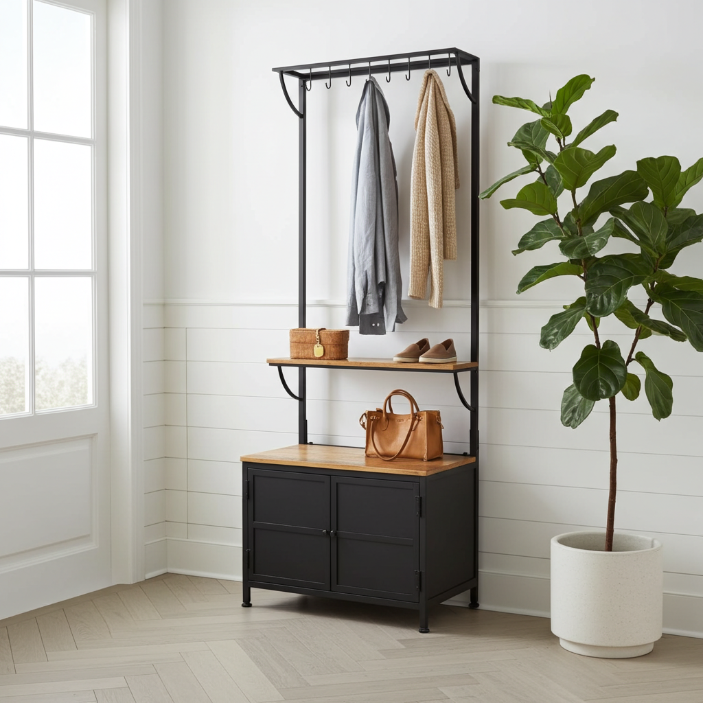 Meubles d'entrée avec banc et rangement, porte-manteau de 32 po, en bois de manguier et acier, meuble avec étagère de rangement et 8 crochets